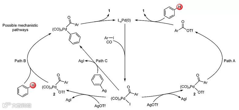 基于以上结果,作者确认该反应机理是芳基碘试剂与AgOTf发生插羰-偶联反应生成ArCOOTf,然后ArCOOTf与芳香烃进行傅克酰基化(Path A)。