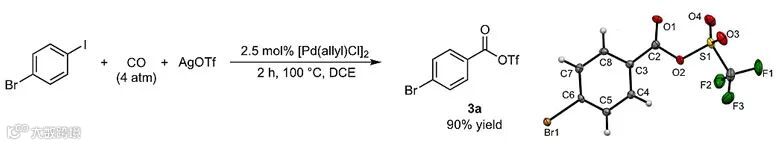 令人意想不到的是,他们不使用配体,仅以[Pd(allyl)Cl]2为催化剂时,对溴碘苯与AgOTf在CO参与下可以通过插羰-还原消除生成ArCOOTf。而通常情况下,ArCOPdOTf自身发生还原消除反应并不容易。