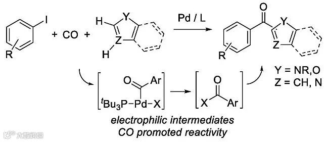 2013年,加拿大麦吉尔大学的Bruce Arndtsen教授等人通过钯催化的插羰反应合成了各种芳基取代的酰氯化合物。只有使用大位阻的PtBu3为配体时,插羰中间体tBu3PPd(COAr)Cl可以还原消除得到ArCOCl产物,而CO也能促进这一过程。随后,他们又报道了钯催化杂芳香烃的C-H键羰基化反应,合成了各种杂芳香酮化合物。他们认为反应有可能先通过钯催化的芳基碘和CO的插羰反应生成了酰基碘化物,随后发生杂芳香烃的傅克酰基化反应。但是作者并没有尝试简单的芳香烃,虽然酰基碘化物的活性已经相当高,但在没有傅克反应催化剂的条件下,可能很难和芳香烃发生反应。