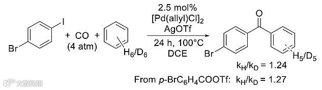 同时,他们发现该反应的动力学同位素效应(KIE)为1.24,与ArCOOTf参与的傅克酰基化反应(KIE = 1.27)相同。