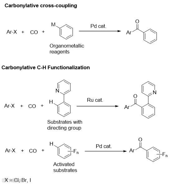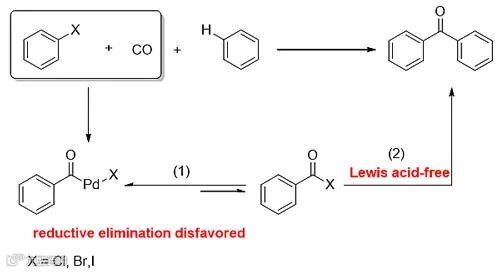 同样是合成芳基酮化合物,酰基化反应的优点是芳香烃的C-H键容易断裂,缺点是需要制备酰氯试剂;而C-H键羰基化反应的优点是使用CO为羰基源,缺点是芳香烃的C-H键不易断裂,使用CO现场生成酰卤试剂,然后发生酰基化反应似乎就可以将二者完美结合。这个想法听起来很简单,做起来却很难,主要有两方面问题:(1)过渡金属催化芳基卤化物的插羰反应不易通过还原消除过程生成酰基化试剂;(2)酰基化过程中使用路易斯酸催化剂可能会使反应体系变得复杂。是否可以原位生成亲电活性更高的酰基化试剂成为化学家们思考的问题。