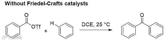 既然酰基化试剂可以通过芳基卤化物与CO的插羰反应合成,那么剩下的问题就是如何原位生成亲电活性更高的酰基化试剂,让其可以在没有催化剂的环境下和芳香烃发生傅克酰基化反应。早在1996年,德国斯图加特大学的Franz Effenberger教授等人报道了ArCOOTf参与的傅克酰基化反应合成芳香酮化合物。由于ArCOOTf具有很强的亲电性,反应无需使用催化剂,在室温下DCE溶剂中即可发生,底物可以是普通芳香烃。