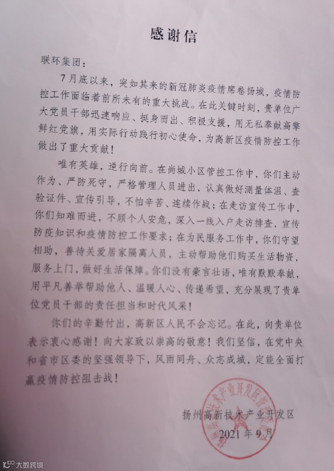 自疫情爆发以来,联环集团冲锋在前筑堡垒,抗击疫情显担当,宣传引导凝心、精准防控暖心、体贴服务尽心,用实际行动筑牢抗疫防线,为群众筑起安全屏障。向上向善,必有回响。9月4日,扬州高新技术产业开发区为联环志愿队送来感谢信,为他们对小区疫情防控的辛劳付出表示感谢,这是对联环志愿者的褒奖,更是一种激励,联环志愿者将慎始如终地坚守岗位、担当实干,为取得扬城抗疫全面胜利站好最后一班岗。