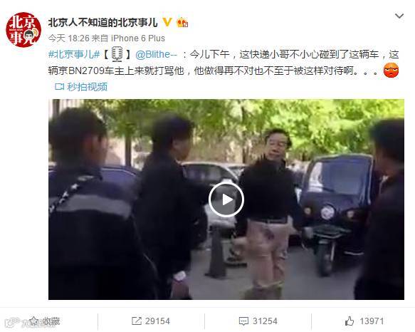 根据视频内容,在北京市东城区富贵园一区内,一位顺丰快递员骑着货运三轮车,与一辆黑色京B牌照小轿车发生轻微碰撞,随后轿车司机——一位四五十岁的中年人,下车连抽快递员好几个耳光, 并伴随着“我操你MLGB的”、“臭丫挺的”、“你他妈……”、“你他妈以为你谁,丫挺的”、“我楔死你”等各种京骂。在一位路人劝阻的情况并在快递员说“对不起!”后让然不依不饶,并说“对不起有什么用?”