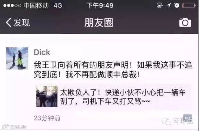 疑似顺丰总裁王卫的朋友圈截图流出,这位用户名为“Dick”的用户,昨晚9点半左右转发某公众号文章时写道:“我王卫向着所有的朋友声明!如果我这事不追究到底!我不再配做顺丰总裁!”随后其又在自己发布的信息评论去呼吁大家理性维权——“人家犯法,我们可不要违规。”王卫的百度百科资料亦显示,其英文名确为“Dick”。