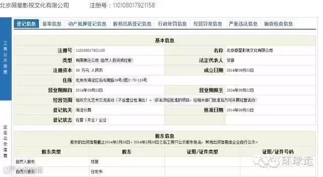 如图下所示,根据官方注册消息,薇星影视成立于2014年,注册资本50万元人民币,股东分别是甘薇和任发书,后者与任勇的关系不明。
