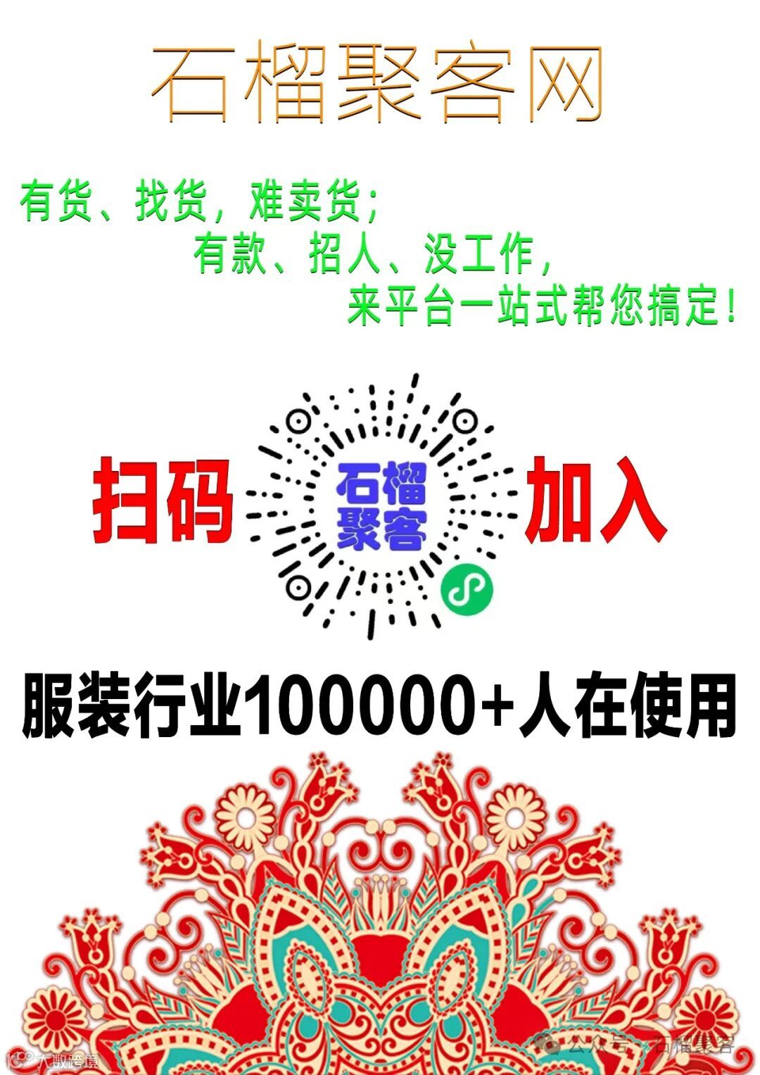 综上所述,"石榴聚客网"是一个致力于吸引和聚集大量用户的网络平台,涉及招工、社交、电商、资源对接、营销推广等多个领域,致力于做中国服装行业最有价值的资源对接平台。