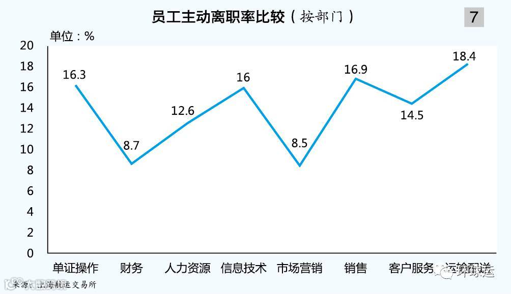 从细分部门的员工稳定性来看,2017年主动离职率最高的四个部门为运输配送、销售、单证操作和信息技术,主动离职率均超过16%。具体而言,单证操作为16.3%,财务为8.7%,人力资源为12.6%,信息技术为16.0%,市场营销为8.5%,销售为16.9%,客户服务为14.5%,运输配送为18.4%。(见图7)
