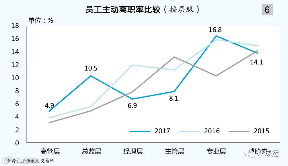 从岗位层次来看,专业层职位、辅助层职位的员工主动离职率一直维持在比较高的水平,其中,专业层的员工主动离职率为16.8%,辅助层的员工主动离职率为14.1%。(见图6)