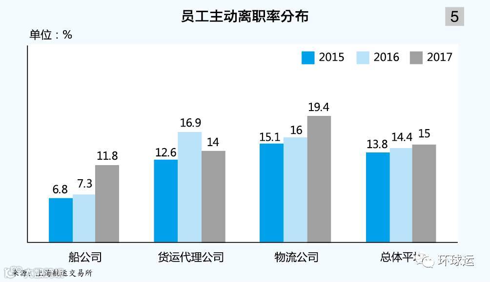 《薪酬调研报告》显示,2015—2017年连续三年的员工主动离职率基本维持在15%上下,波动不大,其中2015年主动离职率为13.8%,2016年主动离职率为14.4%,2017年主动离职率为15%。从三个细分行业来看,船公司和物流公司2017年的员工主动离职率均有不同程度提高,而货运代理公司的员工主动离职率则有回落。从连续三年的比率来看,2015年物流公司员工主动离职率最高,为15.1%,高于船公司的6.8%和货运代理公司的12.6%;2016年货运代理公司员工离职率最高,为16.9%,高于船公司的7.3%和物流公司的16.0%;2017年物流公司员工主动离职率最高,为19.4%,高于船公司的11.8%和货运代理公司的14.0%。(见图5)