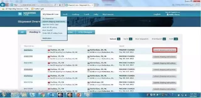 5)与提单补料一同提交,进入“我的马士基”,选择“Submit Shipping Instructions”