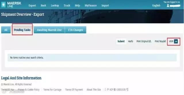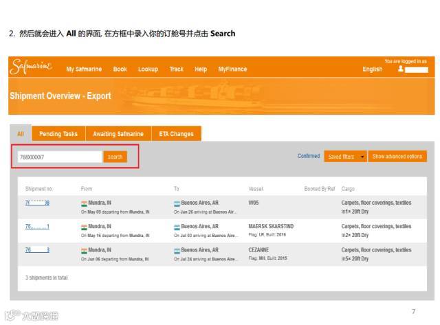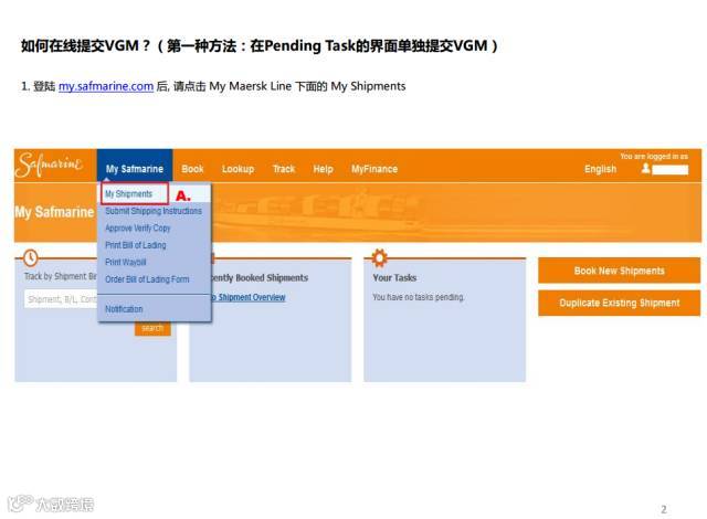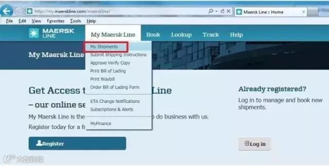 1)登陆 my.maerskline.com,点击“My Maersk Line”下面的”My Shipments”