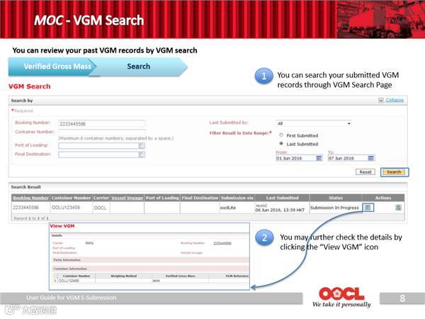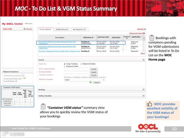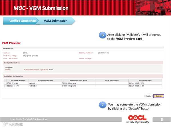 如当地码头公布的VGM截止时间早于OOCL船公司的标准,OOCL船公司的VGM 截止时间应在码头公布时间的基础上做相应调整