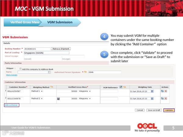 比如,集装箱A共需要签发5票提单。可以选择任意一票订舱号提交整柜的VGM信息,而不需要在所有5票订舱号下都提交。请注意,同一箱号项下在该船VGM截止时间前,只有最后一次提交的版本将被视为唯一有效的信息。