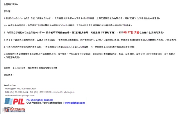 我们鼓励客户通过电子渠道提交VGM,目前不收取任何费用。如有任何更新,将及时公布。