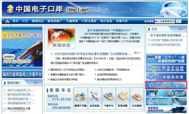 其实,从2015年开始,广大企业足不出户就能通过互联完成年报提交工作了。只要登陆登录“中国电子口岸”(http://www.chinaport.gov.cn)上的“海关企业管理网上办事平台”(如下图红框所示),即可在网上进行电子年报的报送工作。