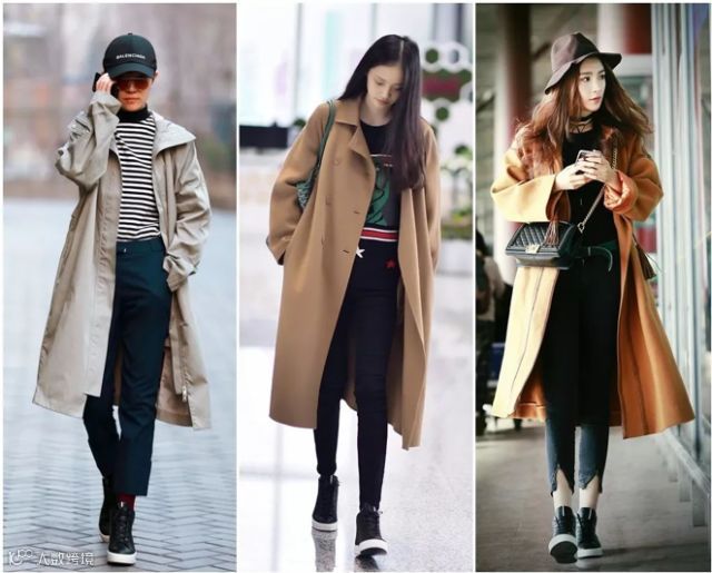 “驼色大衣也可以使用这样的内搭思路,从内搭到鞋子采用黑色顺色,营造脖子以下都是腿的视觉效果。”