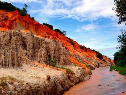 如果把溪流比做人生的道路,那么赤脚下犹如岩浆般的鲜红细沙好似一路的羁绊,加之周围的高耸嶙峋怪石,如果你惧怕,自然感到压力剧(Shan)增(Da);反之,你坦然面对,透明度极高的蓝天会让你豁然开朗。