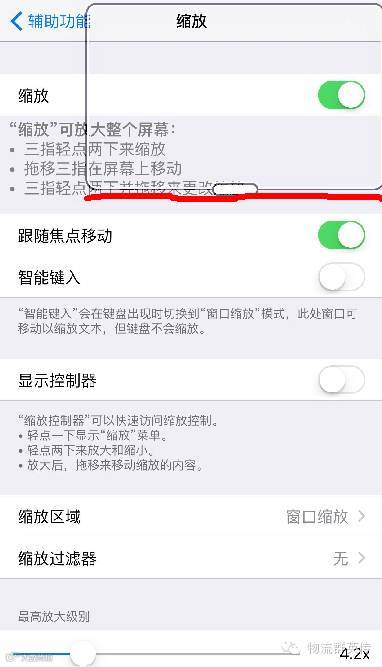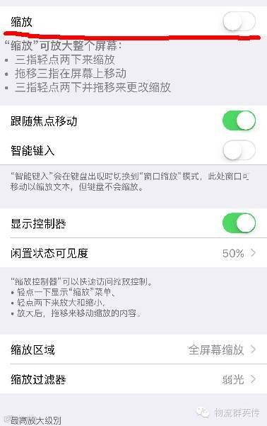 首先,你的手机必须是IOS版本的(好吧这句是废话),先打开设置—通用—辅助功能—缩放,这几步完成以后会出现下面这个界面,接着: