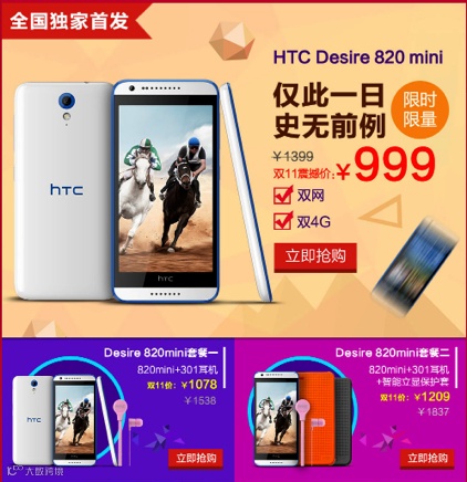 不疯狂不罢休,除超低价优惠外,还有超值套餐可供选择。套餐一: HTC Desire820 Mini+301耳机,售价1078,比原价低了460元;套餐二:HTC Desire820 Mini+301耳机+智能立显保护套,售价1209,优惠了近600元,几乎省出了一部手机的价钱,堪称双十一最诚意卖家哦!