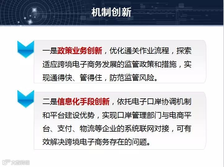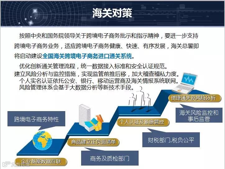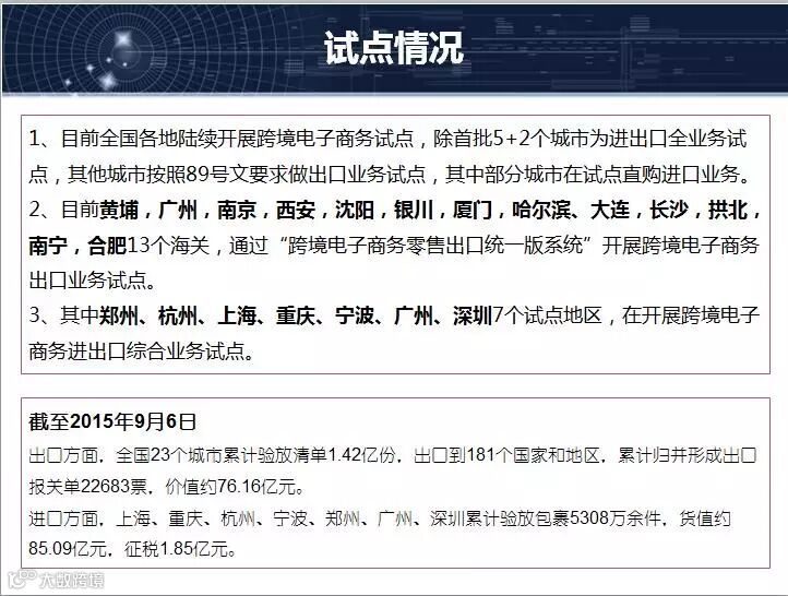 各位朋友上午好!我有15分钟时间,让我把全国试点情况跟大家作一个汇报,我们从国家的政策开始讲起,在跨境电子商务国家政策大家主要记住两个文件,一个是国办发89号文件,另外是46号文件,由我们海关总署会同国家相关部门共同制定的新的文件,大家看到这个文件的时候,可能觉得过去的一个总结,可能还有很多政策结合,我觉得有些时间在今后不断出台的文件可以看到国家政策的结果