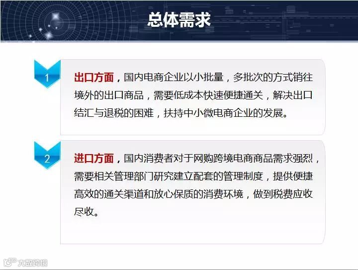 对于国家来说,提出总体需求,一个是在我们出口方面,期望我们,大家可以看到,国内电商企业,我们的以小批量,解决我们出口结汇和退税的困难,进口方面,国内消费者对国外想必也是需求强烈,需要相关部门建立配套管理措施,这是国家对于跨境电子商务的总体需求。要求我们在政策业务创新。