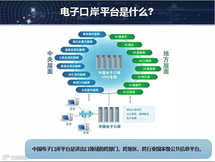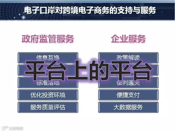 电子口岸平台是什么?在我们平台上,海量的数据,不管有海关的数据,另外,除了这些数据之外,外贸进出口的企业完成相关的申报企业,所以这个平台是具有数据、具有用户的综合的平台,对于我们的海关,对于企业来说,还可以提供政策的解读,便捷支付还有大数据综合服务,这些都是跨境电子商务提供的一些服务。