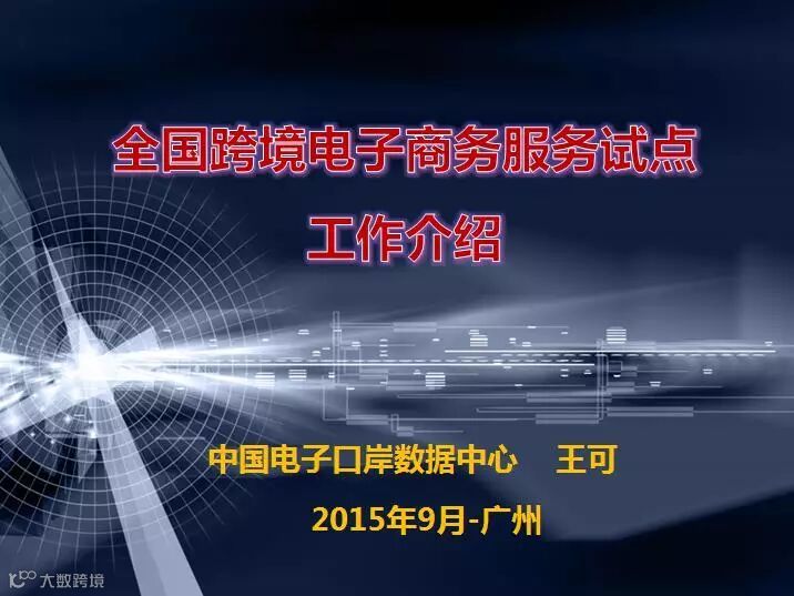 海关总署数据中心副主任王可先生在2015年9月19日广州的中国跨境电商大会暨海贸会代表海关对跨境电商年会的支持发表演讲“全国跨境电子商务海关服务详细介绍”。