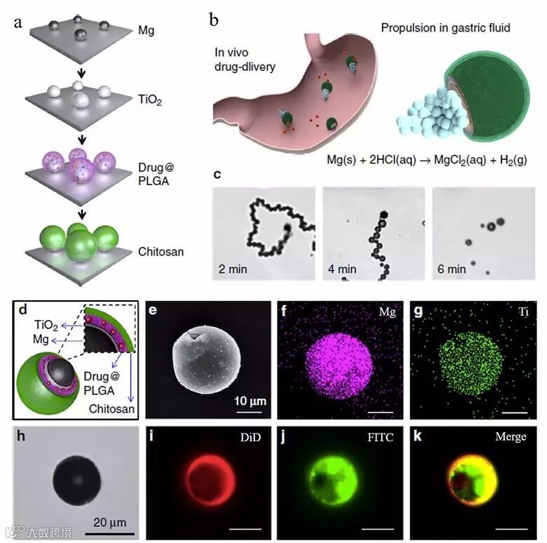 这种马达主体部分为20 µm左右的镁微米颗粒,通过原子层沉积技术不对称地镀上一层TiO2(维持微米颗粒形状)形成了双面神微米颗粒(Janus microparticle,JMP),随后依次负载上一层含有CLR的聚乳酸-羟基乙酸酯(PLGA,用于负载药物)和壳聚糖层(促进颗粒与胃粘膜相互作用并保护PLGA层)。这种马达可以与胃酸中的盐酸发生反应产生氢气,从而推动马达前进,体外模拟实验表明平均速度可达120 µm/s,足以促使微米马达进入胃粘膜,同时前期研究还表明这种镁基马达可以清除胃部盐酸,迅速升高小鼠胃部pH值,因此有望在不使用PPIs的情况下治疗胃部感染。此外,作者还采用扫描电子显微镜、能量色散X射线元素分析以及聚合物荧光标记(PLGA-DiD,壳聚糖-FITC)验证了该微米马达的结构。