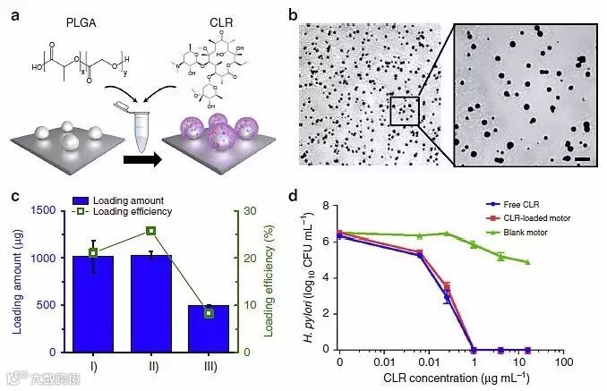 微纳米马达(nano/micromotors)是近年来飞速发展的一个新兴领域,已经在药物递送、化学分析、中和毒素等领域崭露头角。就在近日,一项新研究表明微米马达或许可以解决PPIs治疗幽门螺杆菌产生副作用的问题。这项研究由美国加州大学圣地亚哥分校(UCSD)纳米工程系的Joseph Wang教授和张良方(Liangfang Zhang)教授合作完成,他们开发了一种镁基微米马达,并负载克拉霉素(clarithromycin,CLR)作为模式药物,发现这种马达可以在不使用PPIs的情况下有效治疗幽门螺杆菌感染,同时还具有较好的生物安全性。相关研究发表在Nature Communications 上。