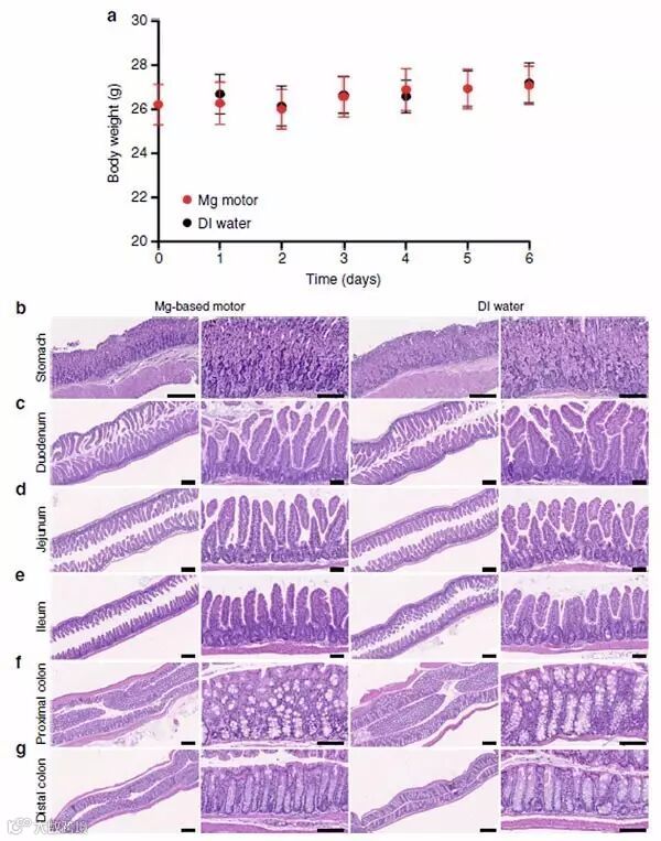 作为一种最终可能应用于人体的药物制剂,除了疗效之外,最重要的是应该就是安全性/毒性问题。为了检测这种微米马达的毒性,作者给健康小鼠连续服用微米马达5天,频率为1天1次,观察小鼠的行为并检测了小鼠的体重。结果发现小鼠没有出现脱毛、嗜睡、萎靡不振、斜眼等不良反应,体重变化也与服用纯水的小鼠相当。作者在第6天时将小鼠处死,收集胃组织及小肠组织进行苏木精伊红染色分析,发现小鼠胃组织及肠组织结构完整,无明显损伤。因此这种马达的生物毒性较小。当然,这仅仅是短期毒性研究,长期生物安全性还有待进一步探索。