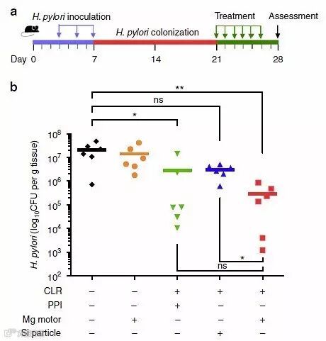 镁基微米马达增强克拉霉素治疗小鼠幽门螺杆菌感染的疗效。图片来源:Nat. Commun.