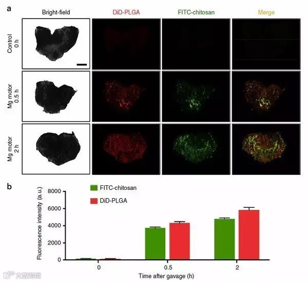 镁基微米马达在小鼠胃部的滞留情况。图片来源:Nat. Commun.