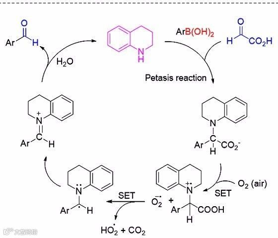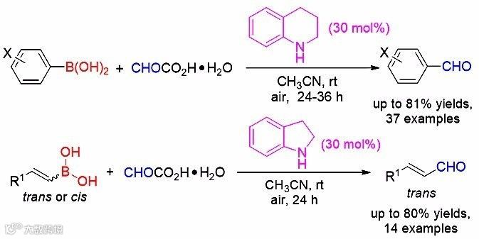 最近,美国新墨西哥大学和华东理工大学的王卫教授课题组在Angewandte Chemie International Edition 上首次报道了无金属参与的以简单的二级芳香胺作为催化剂催化芳基及乙烯基硼酸的甲酰化反应,第一作者为博士研究生黄河。基于该课题组以往有机分子催化反应的经验,他们通过研究已发展的反应,进一步探究其新的活性,成功地设计了一种新型的二级胺催化的芳基及乙烯基硼酸甲酰化反应。二级胺、硼酸和乙醛酸三组分反应原位生成Petasis反应的氨基酸中间体,随后作者对该中间体的氧化-还原性质进行研究,巧妙通过芳香胺修饰的氨基酸中间体自发被空气中的氧气氧化,经单电子转移脱羧形成亚胺,亚胺进一步水解得到醛并释放出二级芳香胺,使之从反应物变成了催化剂的角色。反应过程中的重要中间体通过高分辨质谱得到证实。这种新颖的甲酰化反应条件非常温和,仅使用空气作为氧化剂,可以兼容多种官能团,包括金属催化甲酰胺化不能兼容的卤素与三氟甲氧基等。而使用基本的化工原料乙醛酸作为甲酰化来源,可以规避一氧化碳这种剧毒、易燃的气体,为硼酸化合物的甲酰化和复杂芳香醛及烯醛的合成提供了一条高效实用的途径。