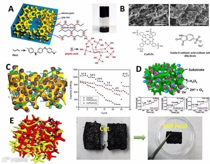 图2. (A)新型导电高分子凝胶利用多官能团分子作为交联剂;(B)凝胶的结构与性质可进行广谱调控;(C)(D)该凝胶应用于电化学能源储存以及生物传感器中;(E)导电高分子凝胶可用于合成多功能复合凝胶材料。