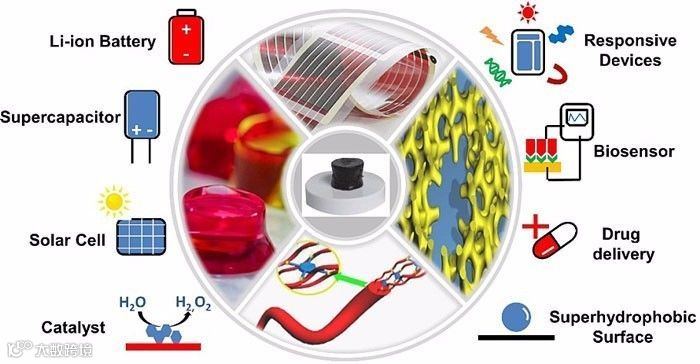 近日,德克萨斯大学奥斯汀分校的赵飞博士、石烨博士和余桂华教授以及南京大学的潘力佳教授合作,近期在化学类的顶级综述期刊Accounts of Chemical Research 上发表了关于三维纳米结构化导电高分子凝胶设计、合成及应用方面的一系列工作,系统总结了采用多官能团分子作为交联剂合成并调控新型导电高分子凝胶的方法,并研究了凝胶三维结构的多种独特性质,最后介绍了新型高分子凝胶在多功能复合凝胶合成、电化学能源储存、能源转化、传感器等领域中的应用(图1)。