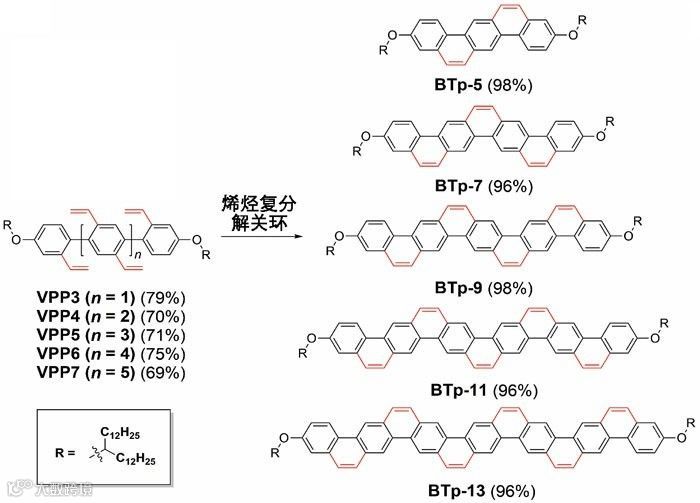 图1. 高效热力学控制的烯烃复分解环化反应构建分别含有5、7、9、11和13个稠环的BTp寡聚物。