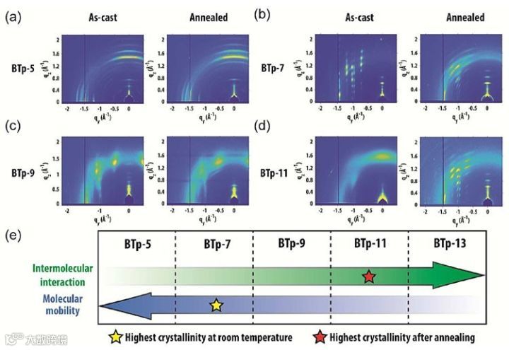 作者利用掠入式X射线散射技术(GIWAXS)探究了BTp系列化合物在固相成膜时的结晶动力学及分子排列与分子尺寸之间的关联。较大的分子因具有强π-π堆积作用而产生较强的分子间作用力,却由于尺寸大而呈现出较低的分子流动性。为了得到较好的薄膜结晶,这两个相互矛盾的因素决定了最佳的分子尺寸必须兼顾结晶所需的分子间作用力和分子流动性。在常温下,结晶性最好的样品为含有7个稠环的BTp-7,而在250摄氏度高温退火以后,结晶程度最高的化合物为含有11个稠环的更大的BTp-11。