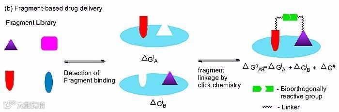 随着各种生物物理学技术的普及,FBDD技术这些年有了长足的发展。人们在明确靶点的情况下找到苗头化合物(hit compound)的速度越来越快。如何将非竞争性苗头化合物连接在一起获得先导化合物则是一个关键问题。这时候点击化学反应隆重登场。除去反应迅速易于构建化合物外,三氮唑等刚性片段还能起到很好的构象限制作用,为稳定活性片段的活性构象提供刚性支撑。