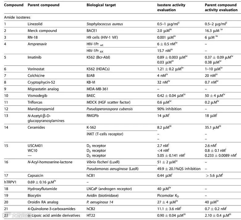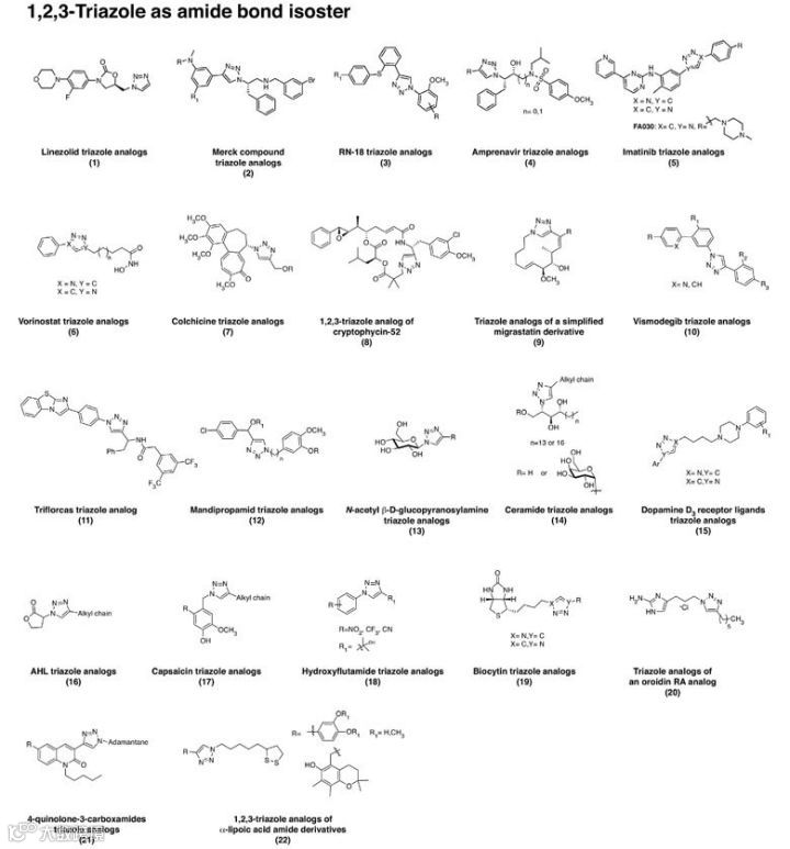化学原创新药研发的核心是新颖的活性化合物结构。对活性化合物进行骨架跃迁是研发人员突破专利限制,提高化合物活性的制胜法宝。这其中,通过点击化学生成的三氮唑类化合物替代其他五元杂环体系是骨架跃迁的常见操作。除此之外,三氮唑还被大量用做酰胺键和刚性双键等基团的生物电子等排体。