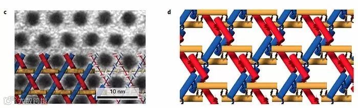 作者进一步将三条超分子线通过CH-π 作用组装在一起,形成如图3所示的三轴超分子编织结构,每条分子线之间的夹角为60˚。作者在文中还使用了多种手段进行表征,该结构之间存在着均匀的六边形孔道(5.5 nm),并且孔道之间还可以容纳Ir纳米粒子,从而形成含有Ir纳米粒子掺杂的功能材料。