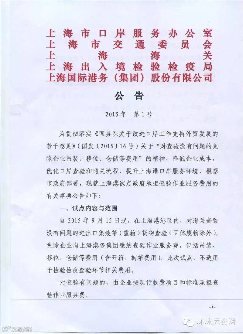 【关于上海港试点政府承担查验作业服务费用的公告】