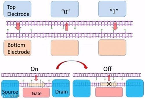 该研究成果通过第一性原理计算表明,卤素功能化磷烯双层具有诸多优异性能。例如,它的磁性可以由其铁电性控制,在高自旋极化、高P掺杂的“开”状态和无磁绝缘的“关”状态之间转换,使 “电写磁读”成为可能;其垂直方向的极化并未因退极化场而消失,使高密度存储成为可能;该功能单元还可集成于二维材料的晶圆中,形成类似于硅晶圆的PN沟道结构。论文还指出,卤素功能化磷烯双层坚挺的垂直极化可归因于共价铁电体不同于离子铁电体的特性,该规律可扩展至其他二维材料(如石墨烯、二硫化钼等)双层,其中每个插入的卤素或氢吸附原子都可存储1比特的数据,与上层成键时可表述为“0”,与下层成键时可表述为“1”,这一结构设计有望用于制成高密度存储的单原子内存。