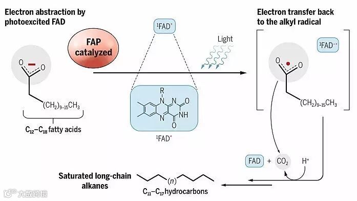 进一步研究之后,研究者认为在FAP催化反应中,FAD会吸收蓝光变成激发态,从C12-C18脂肪酸分子的羧基攫取一个电子,然后发生脱羧反应,产生烷烃或烯烃。饱和脂肪酸底物反应后得到烷烃而不是烯烃,这说明FAP并不会在碳链末端引入双键。另外,FAP的活性口袋尺寸决定了催化C16或C17脂肪酸转化的效率最高。