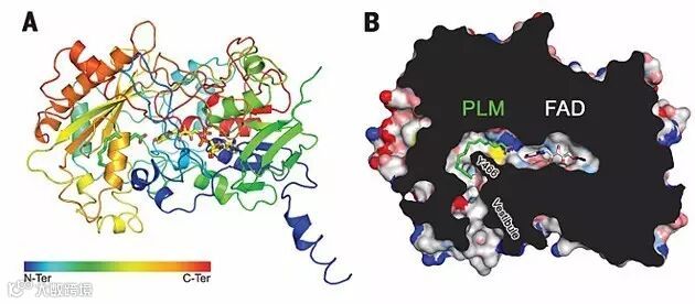 为了进一步研究FAP的活性,研究者表达并纯化了FAP蛋白。质谱分析结果显示,FAP中包含一个黄素腺嘌呤二核苷酸(FAD),而FAD通常是生物化学反应中的氧化还原辅因子。在不同波长的可见光下,研究者比较了酶活性的差别,发现FAP在蓝光(400 nm至520 nm)下有活性。这个波长范围正是FAD的吸收范围,而且光照后反应立刻发生,关闭光源之后反应立刻停止,于是研究者推测,FAD在酶催化中起到了光捕获的作用,并以所获光能驱动反应发生。研究者随后进行了蛋白质结构研究,以棕榈酸(PLM)为底物,得到了FAP-FAD-PLM的立体结构(下图),其中FAP的脂肪酸结合位点所在的疏水通道正通向捕获光的FAD。