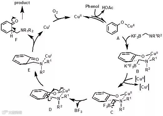 对于该反应具有的专一邻位选择性,作者提出反应过程中可能涉及六元环过渡态的单电子自由基转移机理(图3)。首先,苯酚与CuII配体交换,生成酚铜物种A。然后,胺甲基三氟硼酸钾试剂与CuII配位,形成中间体B。随后,三氟硼酸钾试剂被CuII氧化生成相应的自由基中间体C,C进一步脱去一分子三氟化硼,得到烷基自由基中间体D。该烷基自由基通过六元环过渡态,专一性地进攻苯酚的邻位,同时铜氧键发生均裂,得到酮类物种E。E进一步发生异构化,得到相应的最终产物。CuI进一步被氧气氧化成CuII而完成循环。