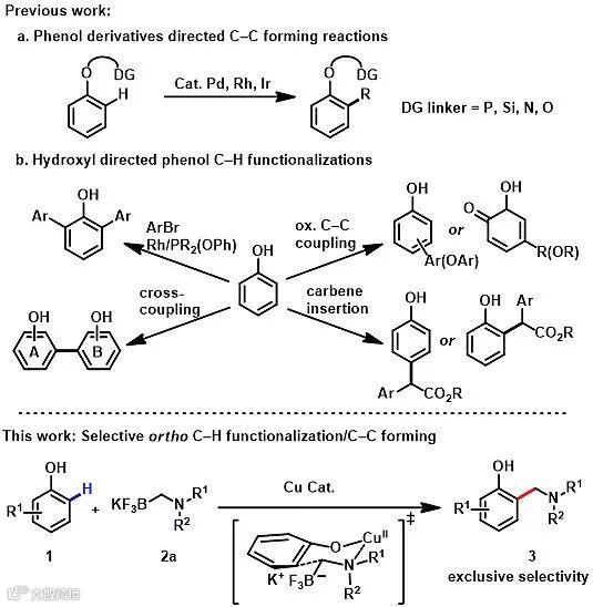 在以往的研究当中,对于酚类化合物选择性官能化的策略,大多是将酚羟基转化成为碳氢键活化的导向基团,从而达到邻位选择性衍生化的目的(图1a)。另一方面,直接使用自由的酚羟基作为导向基团来合成高取代酚类衍生物,则是一种最直接地实现化学反应原子经济性的策略。但是,在这方面的研究当中,反应对酚类底物的选择性一直是困扰着合成化学家们的难题(图1b),目前只有几例报道。