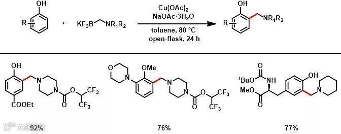 A:如上所述,我们的研究兴趣之一是研究并开发新型的实用性强的自由基偶联反应。苯酚作为一种重要的化工原料,在氧化氛下产生自由基已经有报道。但是问题在于,这一类反应的选择性往往不好。我们的想法很简单,就是通过酚羟基的导向作用,在体系中加入Cu,通过自由基单电子转移的方式来选择性地对苯酚邻位进行官能化,并保留酚羟基官能团。当我们使用胺甲基三氟硼酸钾盐作为偶联试剂时,可以专一地得到邻位偶联的产物。我们通过二维谱等多种检测手段,验证了邻位产物的结构,以及反应的专一选择性。