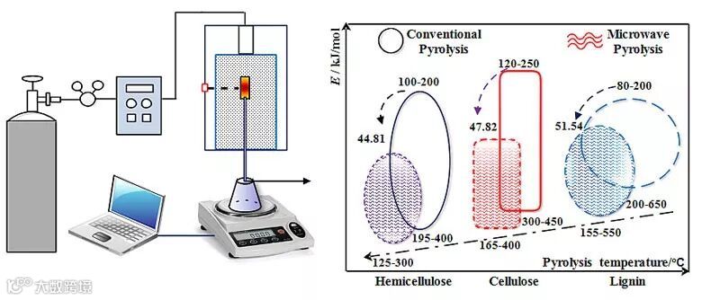 近日,中国科学院低碳转化重点实验室研究团队,充分利用微波的穿透性、整体性和选择性加热等优势,自主设计搭建了微波热重分析平台(专利申请号:201611047356.6,精度可高达1‰),对生物质的热解过程进行深入研究,发现木屑最佳热解温度能够从600 ℃降低至400 ℃,表观活化能降低了50-100 kJ/mol(Bioresource technology, 2017, 238, 109-115)。在此基础上,为了进一步分析微波热解低温特性,对纤维素、半纤维素和木质素等生物质主要组分低温热解行为进行了深入探究,利用KAS方法建立了生物质三组分微波热解反应动力学模型,研究表明,生物质三组分在微波加热下的起始热解温度较传统热解降低了50-120 ℃,且各自表观活化能分别为47.82、44.81 和 51.54 kJ/mol,较传统热解降低了50-150 kJ/mol。结合分析三组分的本征介电性性质与热解失重过程的关联特性,认为在热解主要温度区间内三组分的介电损耗因子存在着随温度升高而增加的特性,从而导致局部飞温区域的出现,并生成瞬态的微波“热点”,加速了热解反应并强化了热量传递,造成了热解温度和表观活化能的降低。