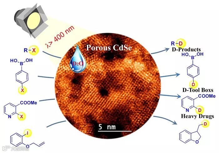 在这项工作中,作者通过在CdSe纳米片上引入多孔结构,调节了其能带结构并暴露更多催化活性位点,有效地同步催化重水分解和碳-卤键断裂(图2)。在可见光的照射下,光生电子分别转移至重水和卤化物分子,在催化剂表面形成氘自由基和碳自由基活性物种,两种自由基偶联形成最终的氘代产物。相应的光生空穴则转移至亚硫酸钠牺牲剂,使催化剂恢复至基态,同时完成催化循环。作者通过飞秒激光吸收谱证实了光催化剂与反应底物之间的电子转移,并通过顺磁共振波谱对反应过程中的自由基历程进行了证实。